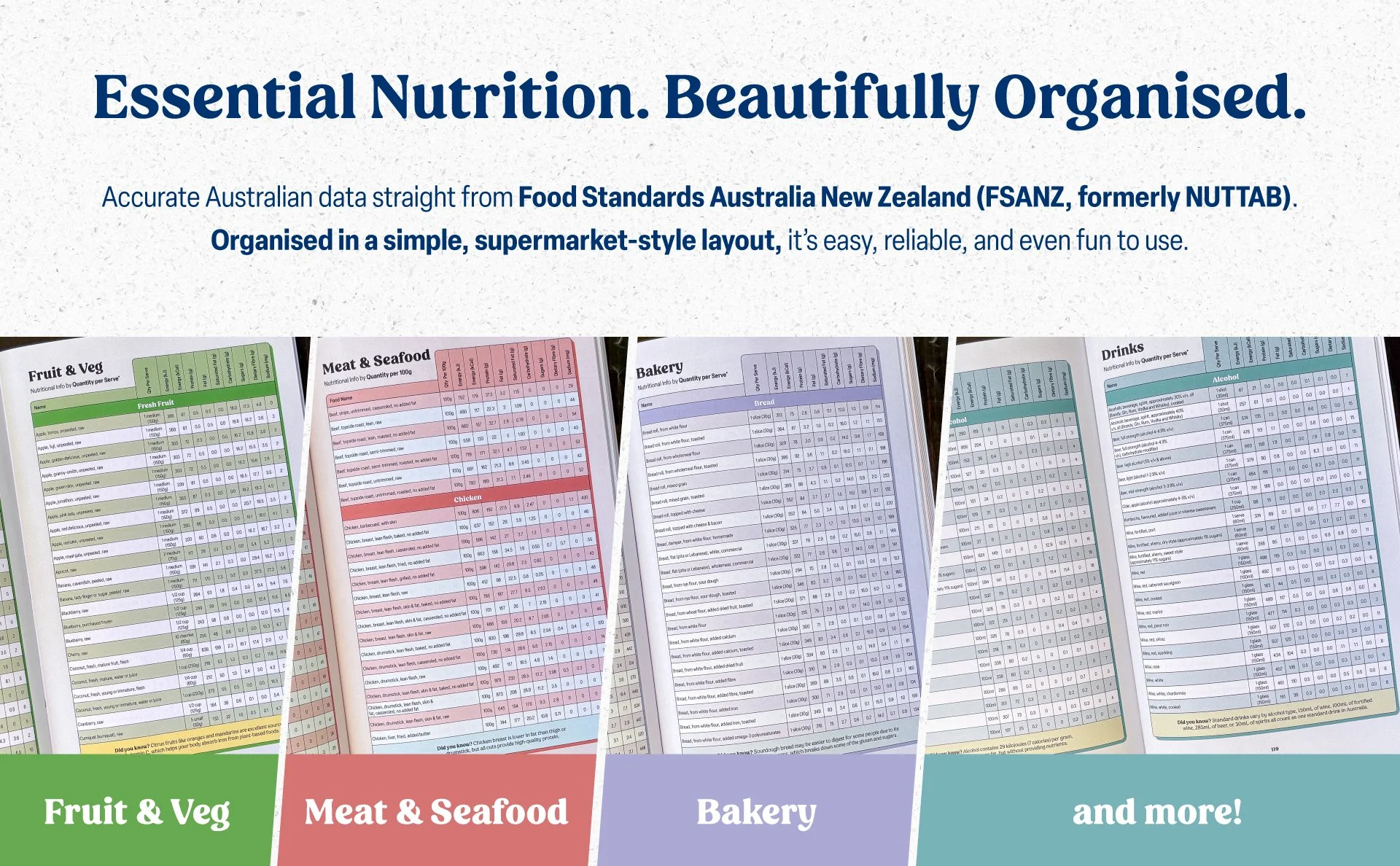 Tired of confusing food-tracking apps and clunky reference books? This beautifully designed guide brings clarity to your nutrition journey with accurate Australian data straight from Food Standards Australia New Zealand (FSANZ, formerly NUTTAB). Organised in a simple, supermarket-style layout, it’s easy, reliable, and even fun to use. Track smarter, plan better, and enjoy a guide that looks as good as it works.