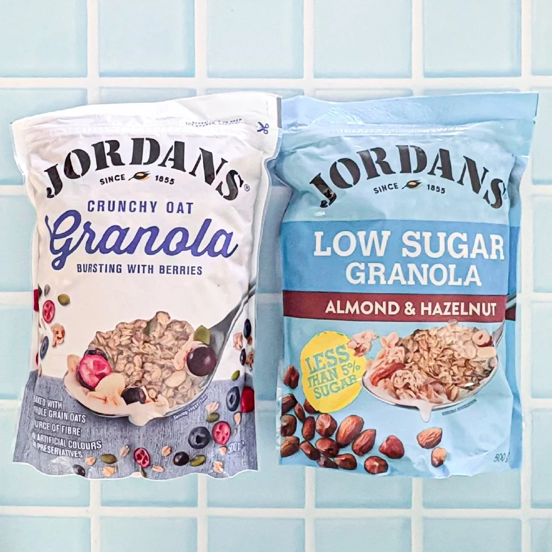 I recently picked up two products from the same brand - Jordans granola. One is their regular Crunchy Oat Granola Bursting with Berries. The other is their Low Sugar Granola Almond and Hazelnut.
