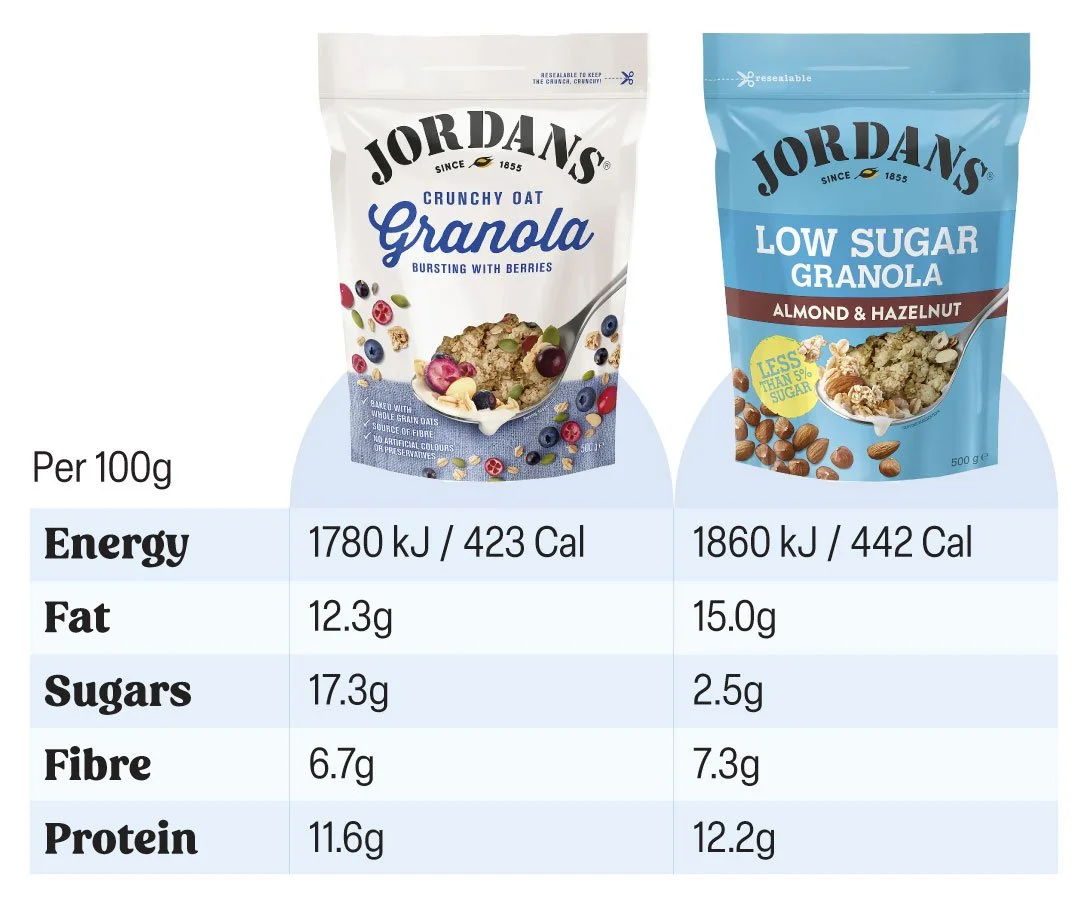 But the Low Sugar version also has more calories - 442 vs 423 per 100g. And more fat - 15g vs 12.3g per 100g.