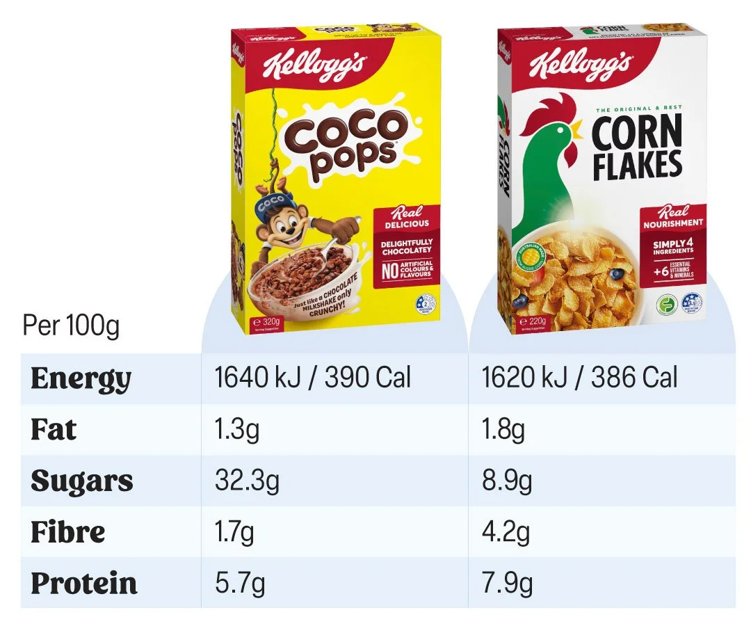 Per 100g, Corn Flakes comes in at 386 calories and Coco Pops at 390 - a difference of just 4 calories. That's not a typo.